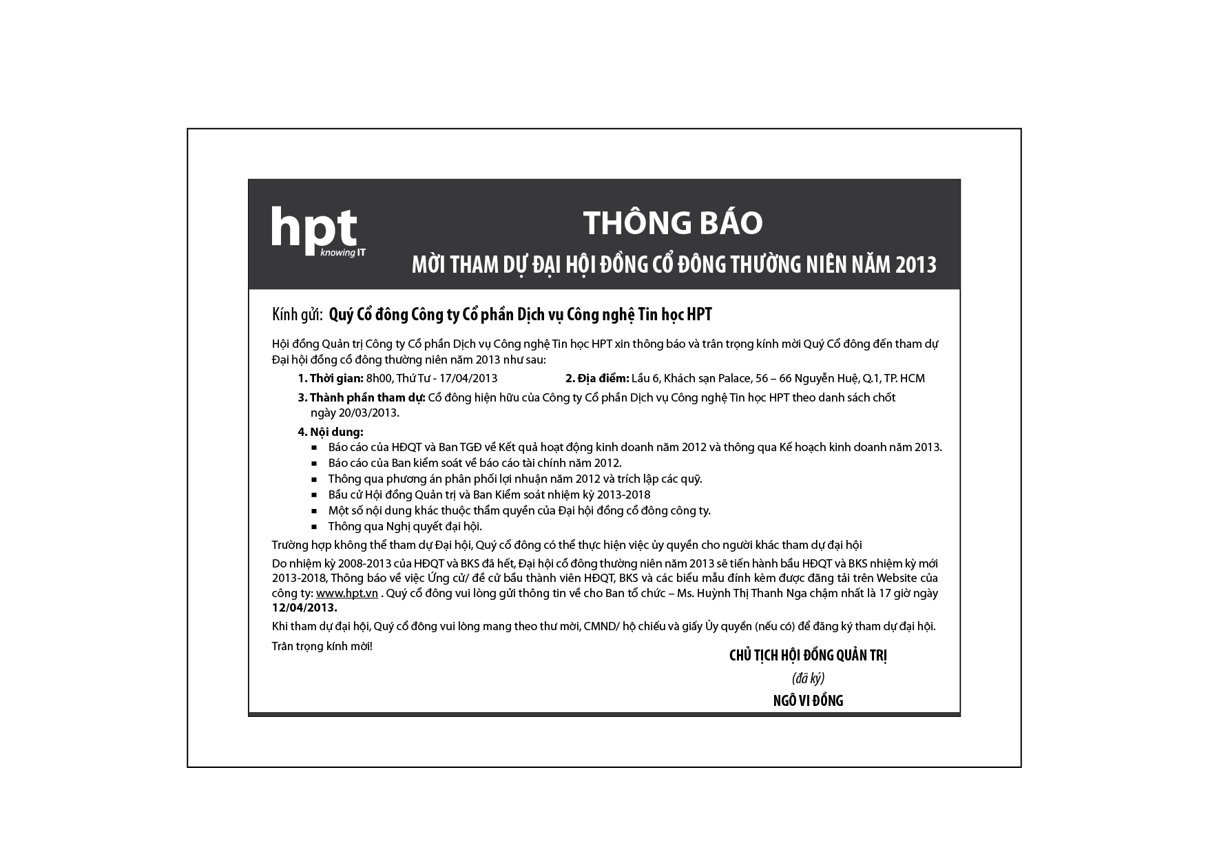 Thông báo mời tham dự Đại hội cổ đông năm 2013